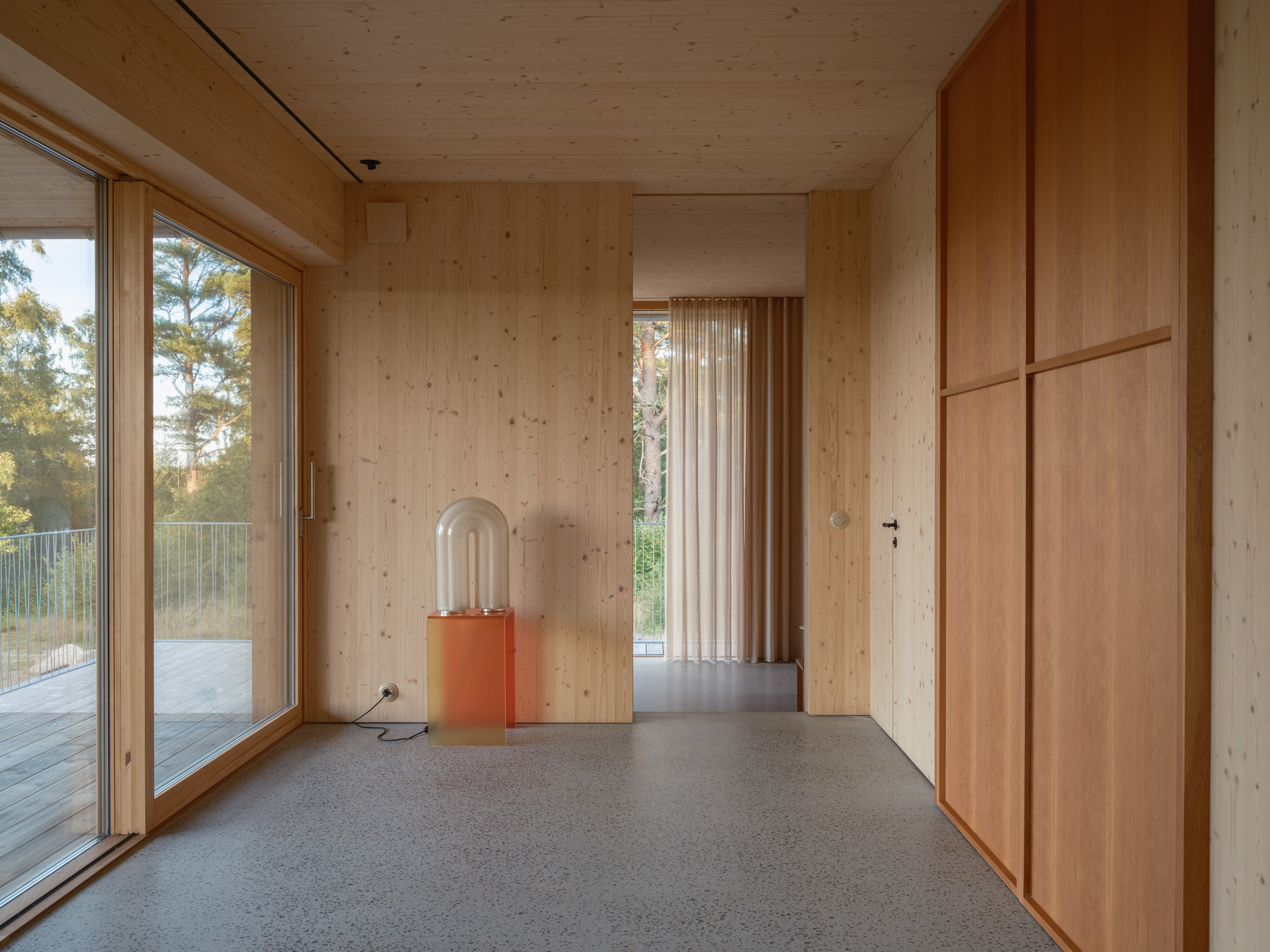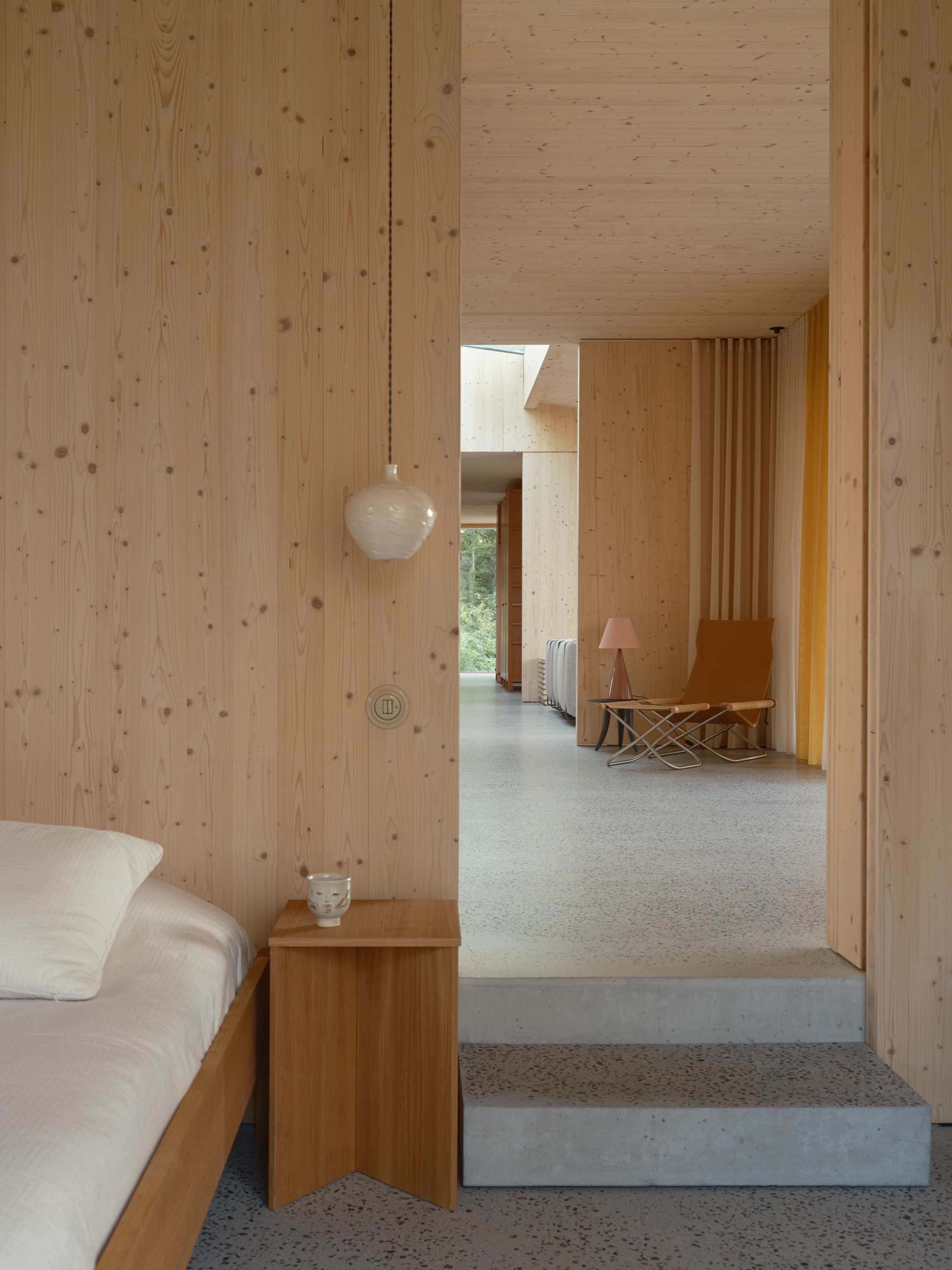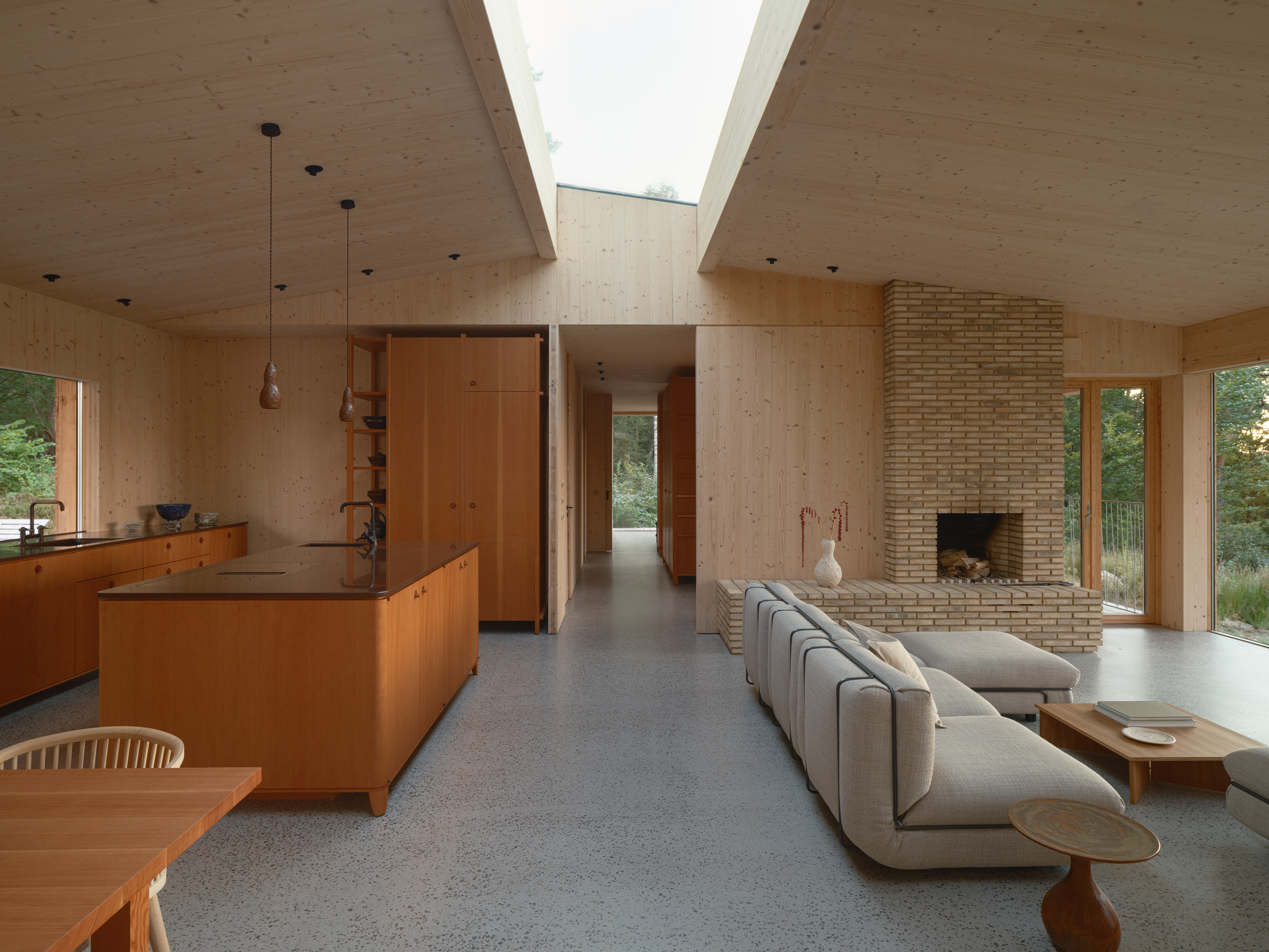 The home celebrates authenticity and tactile experiences, with the wooden construction fully visible and every handmade detail becoming part of the experience. The natural character of the materials and the visible structure contribute to the narrative of the house, offering richness and depth that mirrors the textures and rhythms of the surrounding forest.