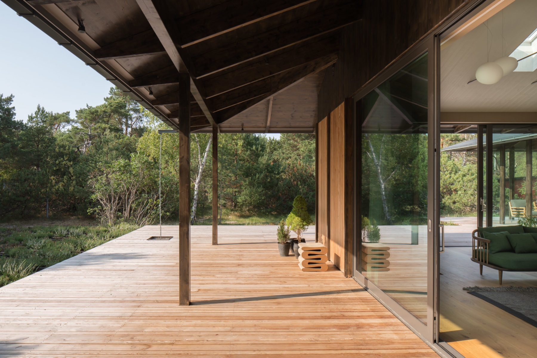 The house consists of three volumes with a common, gently sloping hip roof with generous eaves in all directions. The framework of the house is made out of wood, also containing a few steel components. The material palette thoroughly consists of wood, with natural larch and dark stained fir externally.
